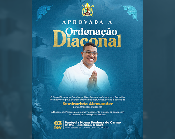 O Bispo Diocesano, Dom Jorge Alves Bezerra, SSS, após ouvir o Conselho Formativo e a comunidade de fiéis nos escrutínios, acolhe com alegria o pedido do Seminarista Alexsander de Souza Pereira para a Ordenação Diaconal.